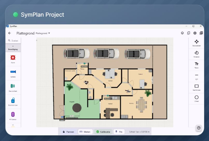 Denk aan camera’s, wifi-punten, sirenes, sensoren of airco’s — alles wat onderdeel is van een installatieplan. Het grote voordeel? Je hoeft geen technisch tekenprogramma te beheersen. In een paar klikken sleep je de juiste symbolen naar de juiste plek, en heb je een overzichtelijke tekening die je kunt bewaren, delen of exporteren voor je klant of je eigen administratie.